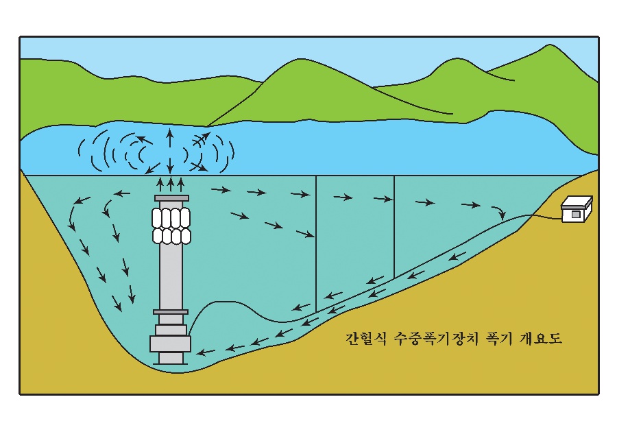 간헐식 수중폭기장치라고도 하며, 호소와 저수지의 수질개선 대책을 목적으로 표층수와 하층수를 혼합하기 위한 장치입니다.