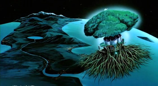 파괴된 라퓨타에서 둘을 구해주는 것이 라퓨타의 하층부에 있는 나무의 뿌리다. 나무[2]는 자연의 사물 중 생명의 중심축으로 가장 광범위하게 알려진 상징이다. 뿌리가 지하에 뻗치고 나뭇가지가 천공에 뻗치기 때문에 많은 민족 문화 중에서 땅과 천공을 연결하는 우주축이라고 여긴다. 즉 나무는 다른 층인 상층과 하층을 이어주는 가교다.