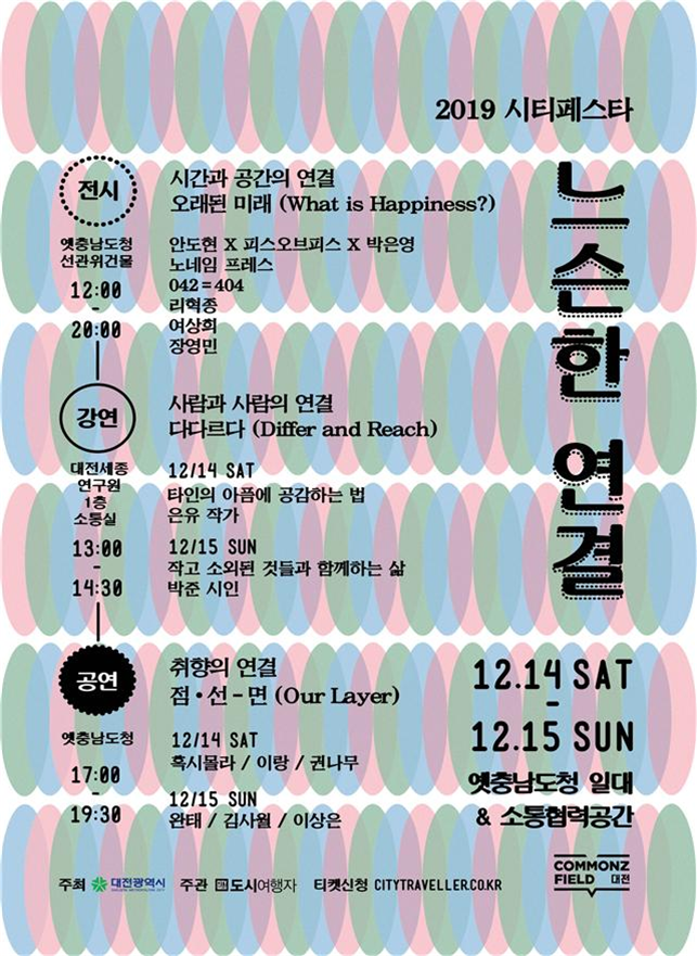 1. 지역거점별 소통협력공간(COMMONZ FIELD 대전)조성 사업의 일환으로 "2019 시티페스타 : 느슨한 연결"이 14일부터 15일까지 옛 충남도청 일원에서 개최된다.