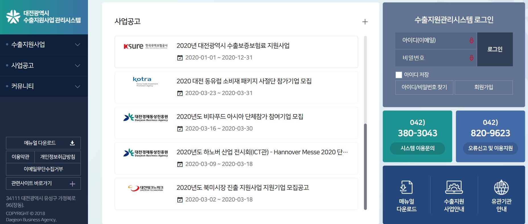 04. 자세한 내용은 '대전광역시 수출지원사업관리 시스템'서 확인할 수 있으며 한국무역보험공사 대전세종충남지역본부를 통해서도 확인이 가능하다.
